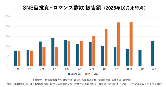 警察庁の発表によると、2025年10月末時点の被害額は1,370.8億円に達し、前年の被害額(1,271.9億円)を既に上回っています。