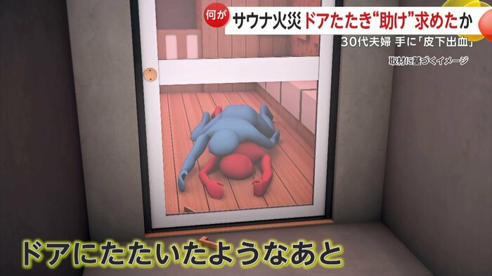 東京・赤坂の個室サウナで30代の夫婦が死亡した火事で、ドアには叩いたような跡があったほか、2人の手には皮下出血があったことがわかった。