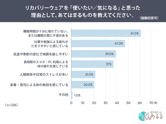 調査の結果、リカバリーウェアに関心を寄せる人の多くが、疲労そのものよりも、睡眠や回復実感に関する課題を抱えている実態が明らかになりました。