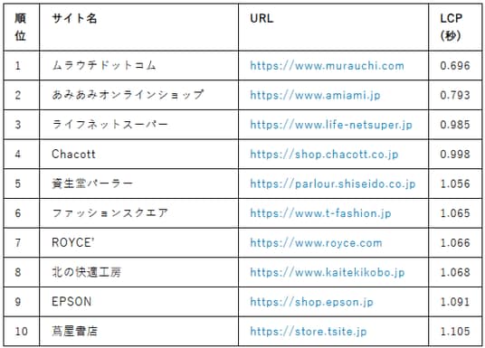 2025年を締めくくるINPトップ5は、タマゴ基地やエレコムなど、年間を通じて上位を維持した常連サイトが顔を揃えました。特筆すべきは、各社がLCP(表示速度)においても高速な数値を記録している点です。「操作への反応」と「表示」の双方で高水準なパフォーマンスを両立し、ユーザーにストレスを感じさせない快適な購買体験を提供しています。