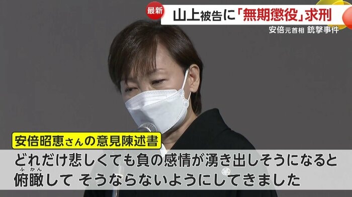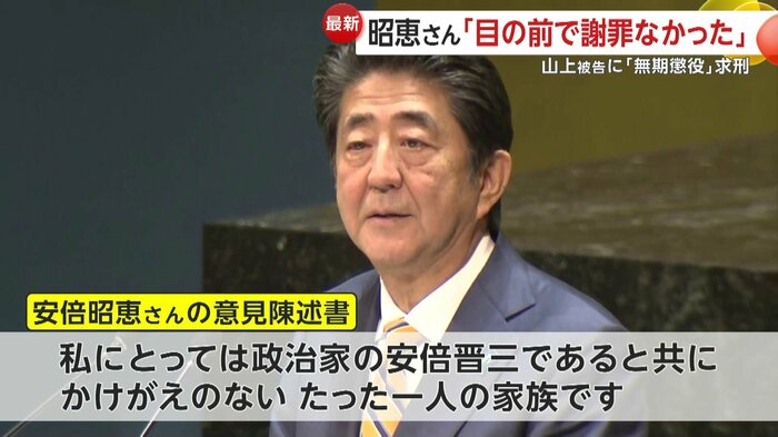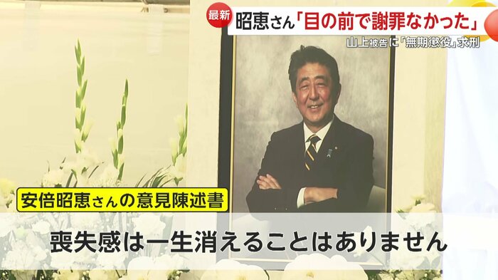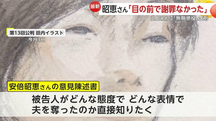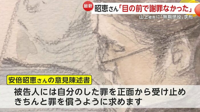 また、午後1時すぎから始まった裁判の冒頭、安倍元首相の妻・昭恵さんの意見陳述書が代理人によって読まれた。そこには、事件や夫への思いなどについて書かれていた。