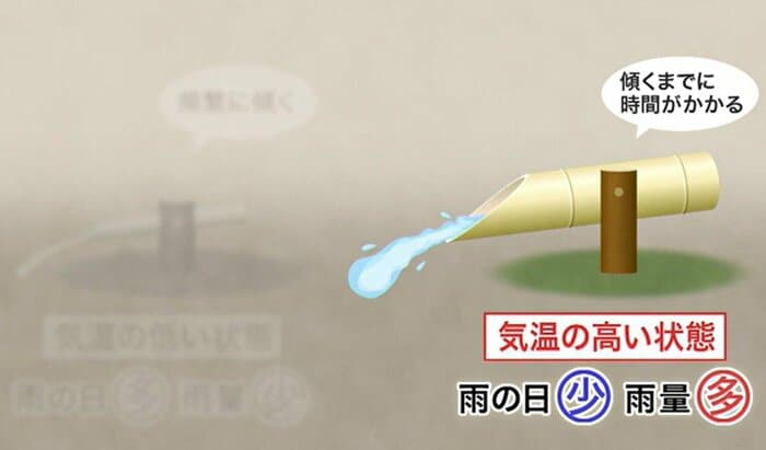 しかし、筒が太いししおどし(気温が高い状態)は、なかなか傾かない代わりに、一度に大量の水を排出する。