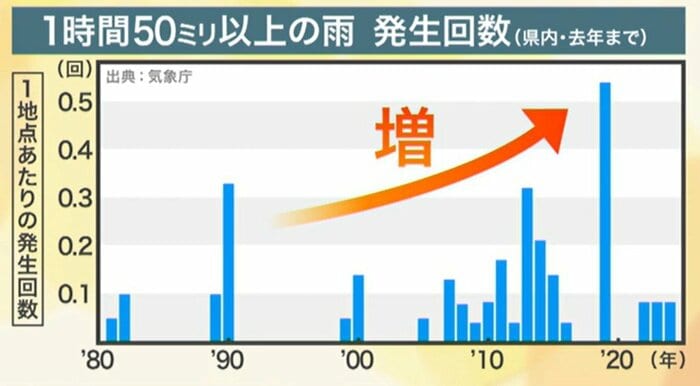 統計を見れば一目瞭然だ。1時間に50ミリ以上の「非常に激しい雨」の発生回数は、1980年代や90年代には稀な現象だった。しかし、2000年代に入ると毎年のように宮城県内のどこかで発生している。