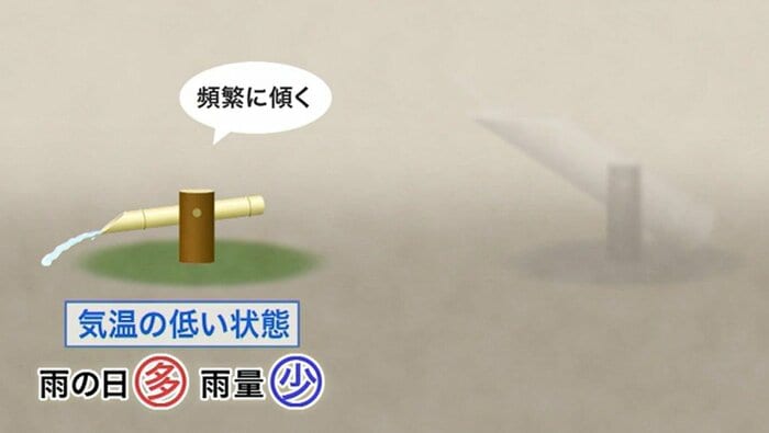 気温が高くなると、大気中に含むことのできる水蒸気の量が大きくなります。そういう性質があるので、一度に降る雨の量が、それだけ多くなるという性質があります。なかなか(雨が)降りにくいけれども、一度降るとたくさんの量の雨が降る。そういう傾向になってきていると思います。