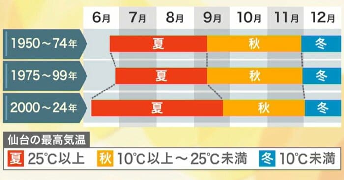 仙台の過去25年間の気温データをもとに「夏」の期間を検証すると、1950年代から90年代にかけては大きな変化がなかったのに対し、2000年代以降は「夏」が30日程度長くなっていた。一方で「冬」の入りは大きく変わっていない。つまり、秋が劇的に短くなっているのだ。