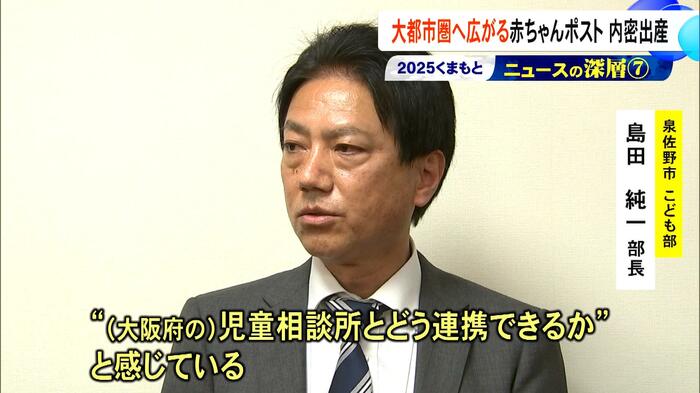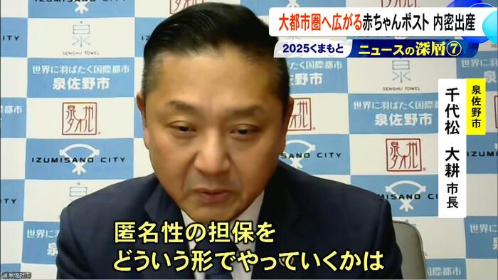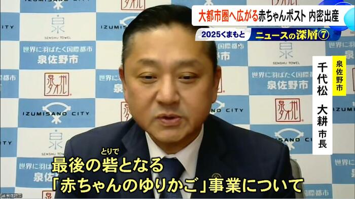 シリーズで伝える『くまもとニュースの深層』。今回は2025年に熊本から大都市圏へ広がりを見せた赤ちゃんポスト、内密出産について。今回、泉佐野市の千代松市長にインタビューし、国内初となる自治体主導での取り組みについて、熊本の視点から考える。