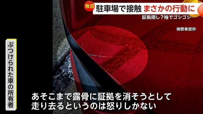 ぶつけられた車の所有者は、「証拠を消そうみたいな感じが見えたので、ちょっと悪質だなと。あそこまで露骨に証拠を消そうとして走り去るというのは怒りしかない」と話す。