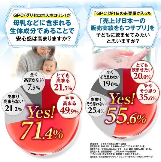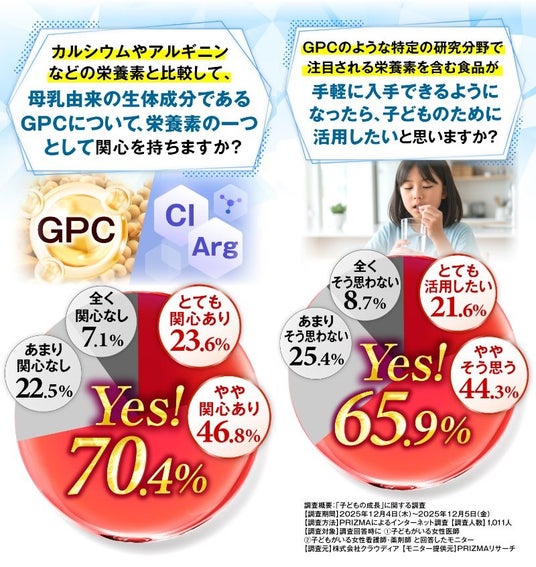 同年代の子どもとの体格差や健診結果に不安を感じる一方で、成長期には「栄養バランス」や「睡眠」が重要と考えられていること、また母乳にも含まれる生体成分「GPC(グリセロホスホコリン)」が、子どもの成長サポートに期待されていることが明らかになりました。