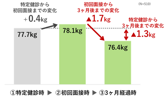 この分析に用いたデータ(N=510)における「特定健診受診日から初回面接実施日までの所要日数」は平均202日(約6~7か月)であり、この期間の影響によって、初回面接時点の腹囲・体重は、特定健診時の数値から変動しているケースが少なくないことが明らかになりました。実際に、特定健診時と初回面接時の体重を比較すると、平均で+0.4kg増加している傾向が認められています。初回面接時の状態によって評価結果が左右される