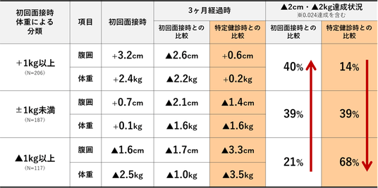 第4期特定保健指導では、特定健診時から腹囲▲2cm・体重▲2kgを達成することが主要達成目標として位置づけられています。一方で、特定保健指導による行動変容や腹囲・体重変動の評価には、初回面接以降の変化を用いるのが一般的です。今回の分析では、特定健診時からの腹囲・体重変化(主要達成目標)と、初回面接時からの腹囲・体重変化(介入成果)は、必ずしも一致しないケースが多く見られることが確認されました。