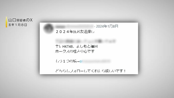 ▼山口容疑者のアカウントとみられるSNS投稿「2024年度お友達探し」「主にHKT48、よしもと福岡、ホークスの呟き中心です」「もう1つの垢→どちらもフォローしてくれたらうれしいです!」(2024年1月8日