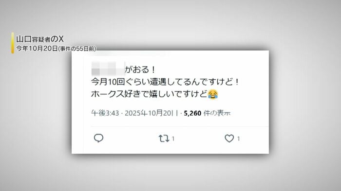 ▼山口容疑者のアカウントとみられるSNS投稿「HKTメンバーがおる!今月10回ぐらい遭遇してるんですけど!」(2025年10月20日 ※事件の55日前)