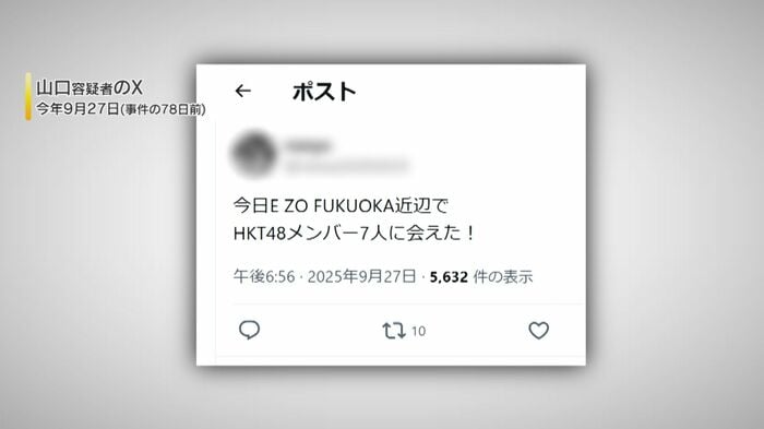 ▼山口容疑者のアカウントとみられるSNS投稿「きょうE-ZO FUKUOKA近辺でHKT48メンバー7人に会えた!」(2025年9月27日 ※事件の78日前)