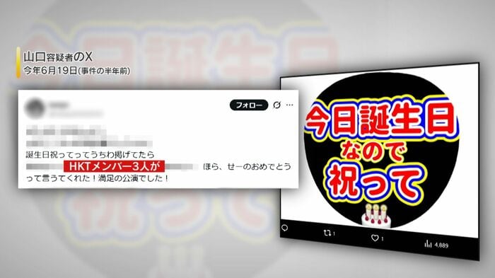 ▼山口容疑者のアカウントとみられるSNS投稿「誕生日祝ってってうちわ掲げてたら」「HKTメンバー3人が『ほら、せーのおめでとう』って言うてくれた!満足の公演でした!」(2025年6月19日)