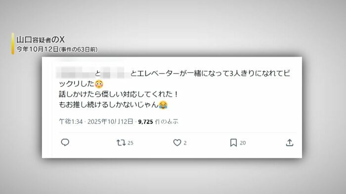 ▼山口容疑者のアカウントとみられるSNS投稿「HKTメンバー2人とエレベーターが一緒になって3人きりになれてビックリした」「話しかけたら優しい対応してくれた!」「もお推し続けるしかないじゃん!」(2025年10月12日 ※事件の63日前)