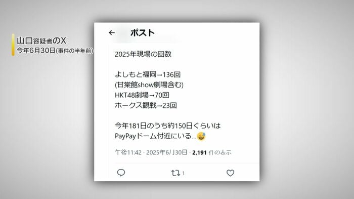 ▼山口容疑者のアカウントとみられるSNS投稿「2025年現場の回数 よしもと福岡→136回(甘棠館show劇場含む) HKT48劇場→70回 ホークス観戦→23回 今年181日のうち約150日ぐらい(原文ママ)はPayPayドーム付近にいる」(2025年6月30日)
