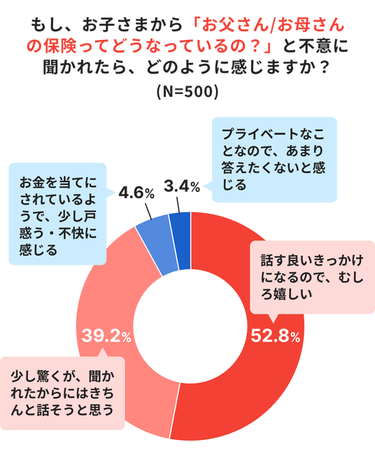 「もし子どもから『保険どうなってるの?』と聞かれたらどう感じるか」という問いに対し、「話す良いきっかけになるので、むしろ嬉しい」(52.8%)、「きちんと話そうと思う」(39.2%)を合わせ、92.0%がポジティブな回答をしました。