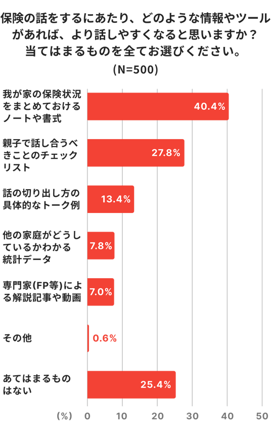 また、話しやすくするためのツールとして「保険状況をまとめるノートや書式(エンディングノート)」(40.4%)や「チェックリスト」(27.8%)が求められています。