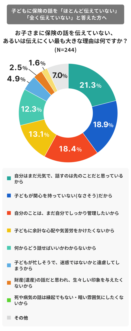 伝えない理由を聞いたところ、「自分はまだ元気で、話すのは先のことだと思っているから」(21.3%)が最多で、次いで「子どもが関心を持っていない(なさそう)だから」(18.9%)、「自分のことは、まだ自分でしっかり管理したいから」(18.4%)という結果となりました。