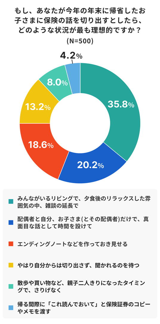 理想の切り出し方は、「改まって時間を設ける」(20.2%)よりも、「リビングで、夕食後のリラックスした雰囲気の中、雑談の延長で」(35.8%)が最多でした。