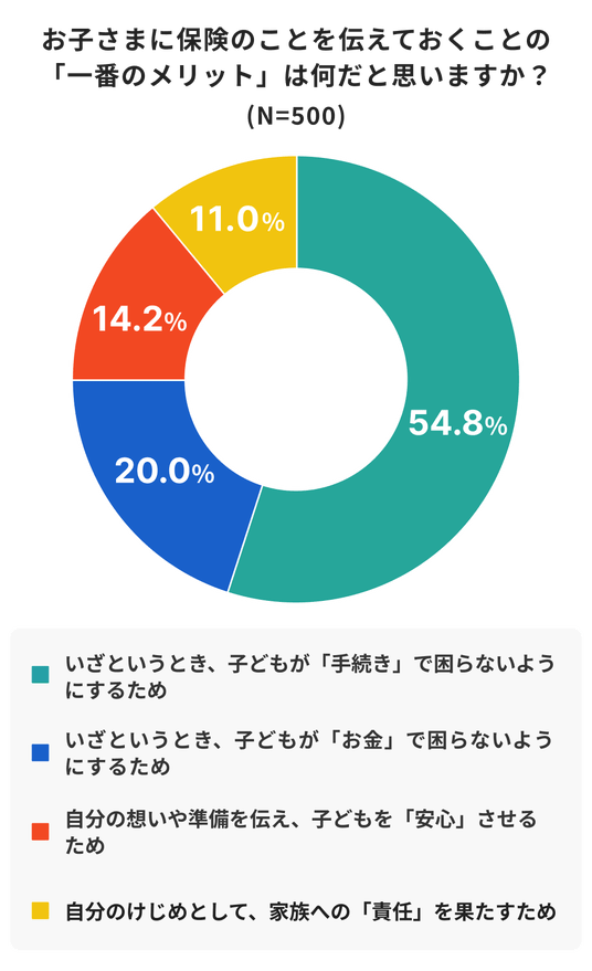 子どもに保険を伝えるメリットとして、過半数(54.8%)が「いざという時、子どもが『手続き』で困らないようにするため」と回答しました。「お金を残しておきたい」という気持ちは当然のことながら、自分が亡くなった後、子どもに面倒な事務手続きで苦労をかけたくないという親心が浮き彫りになりました。