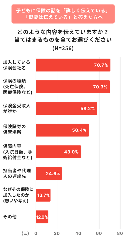 子どもに保険について「詳しく伝えている」「概要は伝えている」と回答した親でも、話している内容を尋ねると偏りがありました。 「保険会社名」や「保険の種類」は約7割が伝えているものの、いざ手続きをする際に必要となる「保険証券の保管場所」を伝えているのは約5割、「代理店の連絡先」に至っては2割台にとどまりました。