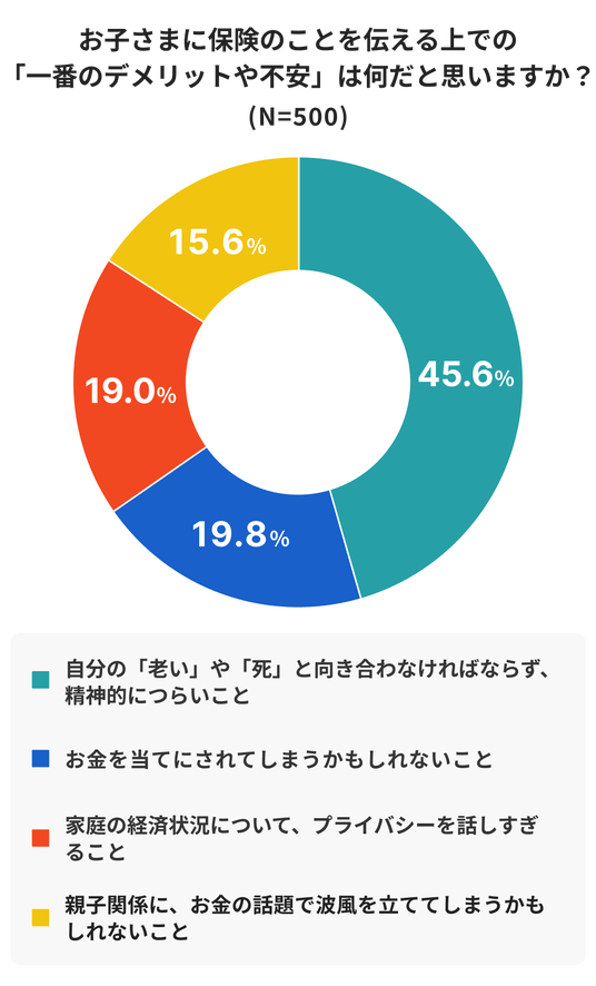 また、子どもへ伝えるうえでの一番のデメリットや不安は、「自分の『老い』や『死』と向き合わなければならず、精神的につらい」(45.6%)ことでした。「お金を当てにされる不安」(19.8%)よりも、「自身の死」を直視することへの負担から、自分はまだ元気だから話すタイミングではないと先延ばしにしているのかもしれません。
