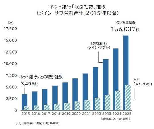 サブバンクとして法人口座を開設するなど、ネット銀行を取引行とする中小企業も増えている。主要なネット銀行10行を、メイン・サブバンクの立ち位置を問わずいずれかの取引金融機関として利用する企業は、2025年調査時点で計1万6037社判明し、10年前の2015年からは4.6倍に増加した。「イオン銀行」など流通・通信系のネット銀行を含め、決済手数料や基本利用料の低さ、決算書不要の新たな少額融資サービスなどを背景に、決済手段として法人口座が必要な企業や、多くの資金を必要としない企業、融資を受けづらいスタートアップ・新興企業を中心に、ネット銀行の口座開設を進める動きが加速した。