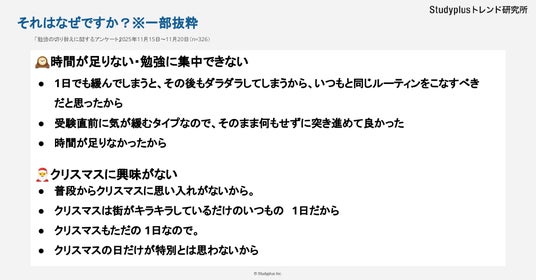 受験生時代のクリスマスに「参加しなかった」ユーザーに、不参加の理由を任意回答で答えてもらいました。