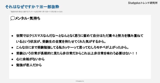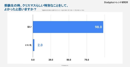 気になる「受験生のクリスマス」参加率は、参加派が4割、不参加派が6割という結果になりました。共通していたのは「選択に後悔はない」という点でした。参加派は、「自宅」で「家族」と特別感を味わったあとに切り替えて勉強したメリハリ型が多く、不参加派は「後悔したくない」というストイックな姿勢がみられました。どちらを選んでも、納得感を持って過ごすことが大切だと分かります。