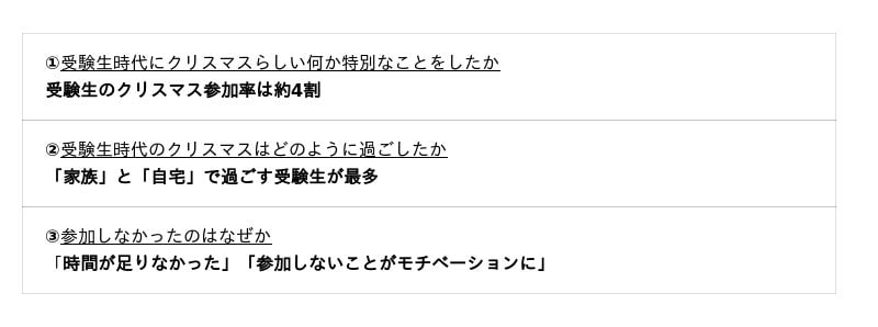 今回の調査では、「勉強の切り替え」を主軸に据えつつ、クリスマス目前のこの時期に合わせて、現役大学生の「受験生時代のクリスマスの過ごし方」について実態を探りました。