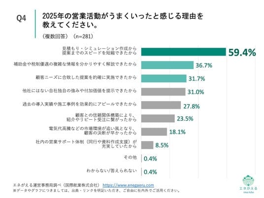 「Q4.Q3で「非常に満足している」「やや満足している」と回答した方にお聞きします。2025年の営業活動がうまくいったと感じる理由を教えてください。(複数回答)」(n=281)と質問したところ、「見積もり・シミュレーション作成から提案までのスピードを短縮できたから」が59.4%、「補助金や税制優遇の複雑な情報を分かりやすく解説できたから」が36.7%、「顧客ニーズに合致した提案を的確に実施できたから」が31.7%という回答になりました。