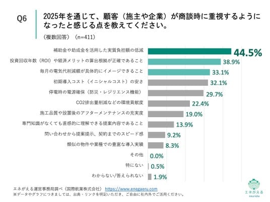 「Q6.2025年を通じて、顧客(施主や企業)が商談時に重視するようになったと感じる点を教えてください。(複数回答)」(n=411)と質問したところ、「補助金や助成金を活用した実質負担額の低減」が44.5%、「投資回収年数(ROI)や経済メリットの算出根拠が正確であること」が38.9%、「毎月の電気代削減額が具体的にイメージできること」が33.1%という回答になりました。