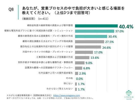 「Q8.あなたが、営業プロセスの中で負担が大きいと感じる場面を教えてください。(上位3つまで回答可)」(n=411)と質問したところ、「補助金制度の最新情報の調査および要件整理」が40.4%、「複雑な電気料金プランに基づく削減効果の試算・シミュレーション」が37.0%、「顧客の納得感を高める提案資料・プレゼン資料の作成」が30.4%という回答になりました。