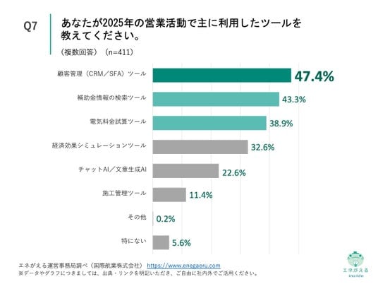 「Q7.あなたが2025年の営業活動で主に利用したツールを教えてください。(複数回答)」(n=411)と質問したところ、「顧客管理(CRM/SFA)ツール」が47.4%、「補助金情報の検索ツール」が43.3%、「電気料金試算ツール」が38.9%という回答になりました。