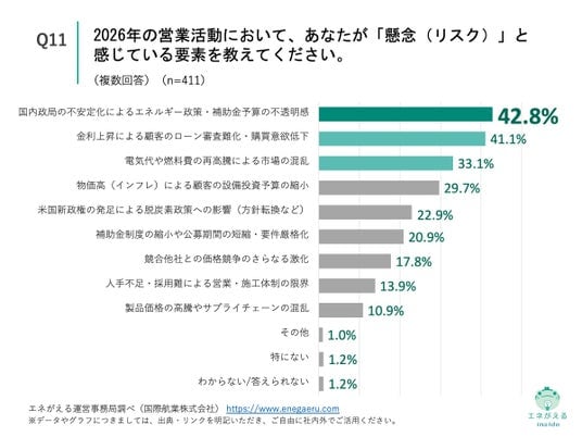 「Q11.2026年の営業活動において、あなたが「懸念(リスク)」と感じている要素を教えてください。(複数回答)」(n=411)と質問したところ、「国内政局の不安定化によるエネルギー政策・補助金予算の不透明感」が42.8%、「金利上昇による顧客のローン審査難化・購買意欲低下」が41.1%、「電気代や燃料費の再高騰による市場の混乱」が33.1%という回答になりました。