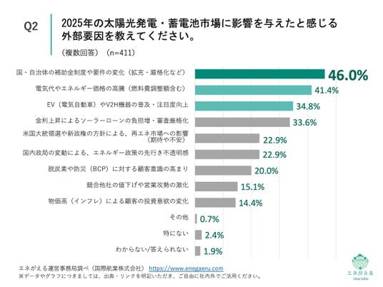 「Q2.2025年の太陽光発電・蓄電池市場に影響を与えたと感じる外部要因を教えてください。(複数回答)」(n=411)と質問したところ、「国・自治体の補助金制度や要件の変化(拡充・厳格化など)」が46.0%、「電気代やエネルギー価格の高騰(燃料費調整額含む)」が41.4%、「EV(電気自動車)やV2H機器の普及・注目度向上」が34.8%という回答になりました。