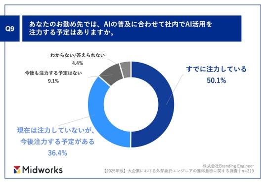 「Q9. あなたのお勤め先では、AIの普及に合わせて社内でAI活用を注力する予定はありますか。」(n=319)と質問したところ、「すでに注力している」が50.1%、「現在は注力していないが、今後注力する予定がある」が36.4%という回答となりました。