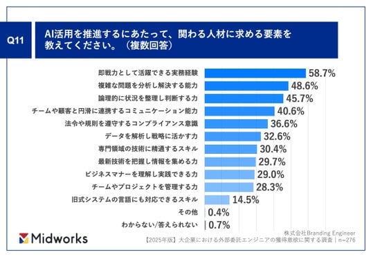 「Q11. Q9で「すでに注力している」「現在は注力していないが、今後注力する予定がある」と回答した方にお聞きします。AI活用を推進するにあたって、関わる人材に求める要素を教えてください。(複数回答)」(n=276)と質問したところ、「即戦力として活躍できる実務経験」が58.7%、「複雑な問題を分析し解決する能力」が48.6%、「論理的に状況を整理し判断する力」が45.7%という回答となりました。