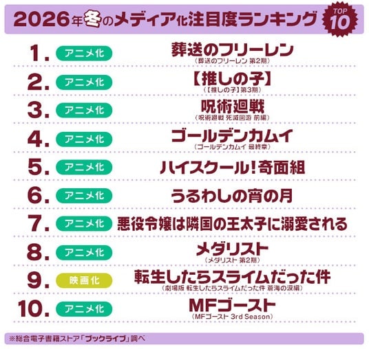 TOPPANホールディングス株式会社のグループ会社である、株式会社BookLive(本社:東京都港区・代表取締役社長:淡野 正)は、運営する総合電子書籍ストア「ブックライブ」にて、【2026年冬注目のおすすめメディア化作品】の特集ページを本日12月19日(金)より公開しました。ブックライブ会員から寄せられた<2026年冬のメディア化作品注目度>アンケートの結果を、ユーザーコメントとともに発表します。