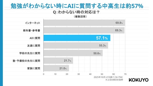 ・「わからない問題はAIに質問」が57%。インターネット(69.8%)や教科書・参考書(69.3%)に次いで、3位。先生や友達に質問するように、AIに質問をして解決を図るという、新しい学習方法の定着が見られる結果に。