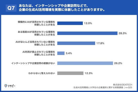 「Q7. あなたは、インターンシップや企業訪問などで、企業の生成AI活用環境を実際に体験したことがありますか。」(n=325)と質問したところ、「積極的にAIが活用されている環境を体験したことがある」が12.0%、「ある程度AIが活用されている環境を体験したことがある」が28.3%という回答となりました。