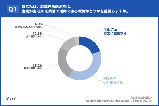 「Q1. あなたは、就職先を選ぶ際に、企業が生成AI(ChatGPT、Claudeなど)を業務で活用できる環境かどうかを重視しますか。」(n=325)と質問したところ、「非常に重視する」が19.7%、「やや重視する」が38.5%という回答となりました。