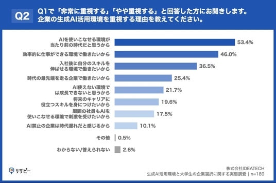 「Q2. Q1で「非常に重視する」「やや重視する」と回答した方にお聞きします。企業の生成AI活用環境を重視する理由を教えてください。(複数回答)」(n=189)と質問したところ、「AIを使いこなせる環境が当たり前の時代だと思うから」が53.4%、「効率的に仕事ができる環境で働きたいから」が46.0%、「入社後に自分のスキルを伸ばせる環境で働きたいから」が36.5%という回答となりました。