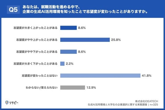 「Q5. あなたは、就職活動を進める中で、企業の生成AI活用環境を知ったことで志望度が変わったことがありますか。」(n=325)と質問したところ、「志望度が大きく上がったことがある」が8.6%、「志望度がやや上がったことがある」が25.8%という回答となりました。