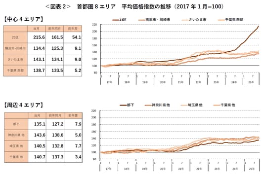 エリア別では、8エリア中3エリアが前月比で下落となったが、直近の推移では3カ月以上連続して下落したエリアはなく、前年同月比では全8エリアが7カ月連続で前年同月を上回っている。