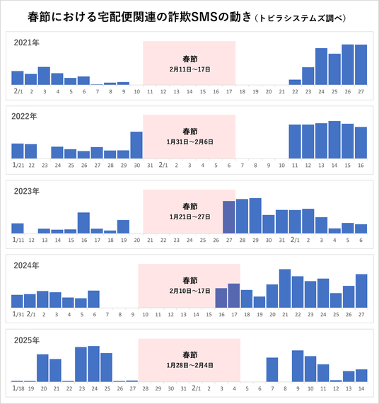 トビラシステムズの調査では、例年、旧暦の正月「春節」の休暇前後に宅配便の不在通知を装うスミッシングが大幅に減少し、春節が明けると元の水準に戻る特徴的な動きが確認されています。このことから、主に春節を祝う習慣があるアジア諸国を拠点とする犯罪グループが、これらのスミッシングに関係している可能性も推測されています。