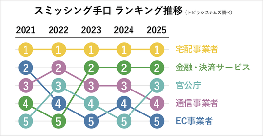 トビラシステムズで観測したスミッシングの手口の割合を5年間の推移で見ると、2021年から2025年まで5年連続で宅配事業者をかたる手口が1位となりました。