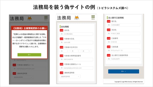 さらに、2025年3月中旬には「法務局」や「北海道警察」をかたるSMSが発生し、誘導先の偽サイトで法人の銀行口座番号や口座残高の入力、企業の代表者の情報、銀行取引に関する書類のアップロード等を求めるフィッシングが確認されました。個人のみならず、法人の情報や資産がフィッシングの標的として狙われていることが伺えます。