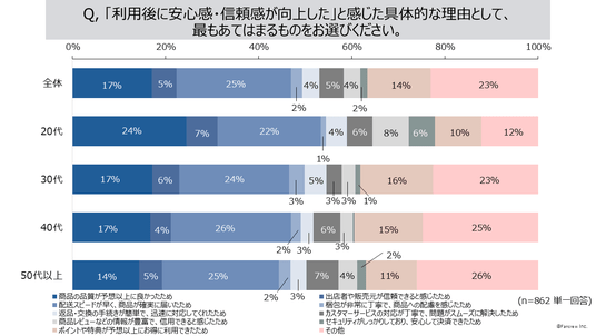 1.利用後に安心感・信頼感が向上したサイトは「Amazon」24%、理由は「配信スピードが早く、商品が確実に届いたため」